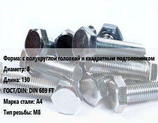 Болт с полукруглой головкой и квадратным подголовником 8х130 DIN 603 FT Сталь: А4 М8, цену уточнять, кг цена от 74.42 ₽ / кг, где купить, условия доставки в Перми и Пермской области