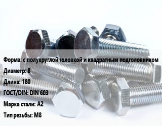 Болт с полукруглой головкой и квадратным подголовником 8х180 DIN 603 Сталь: А2 М8, цену уточнять, кг цена от 19.8 ₽ / кг, где купить, условия доставки в Перми и Пермской области