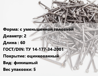 Гвоздь с уменьшенной головкой 2х60 ГОСТ: ТУ 14-177-34-2001 оцинкованный финишный 5