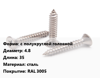 Саморез с полукруглой головкой D=4.8 L=35 сталь RAL 3005, шт цена от 2.97 ₽ / кг, где купить, условия доставки в Перми и Пермской области