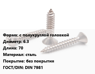 Саморез с полукруглой головкой D=6.3 L=70 сталь без покрытия ГОСТ: DIN 7981
