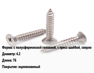 Саморез с полусферической головкой, с пресс-шайбой, сверло D=4.2 L=76 оцинкованный