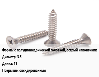 Саморез с полуцилиндрической головкой, острый наконечник D=3.5 L=11 оксидированный