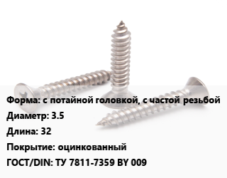 Саморез с потайной головкой, с частой резьбой D=3.5 L=32 оцинкованный ГОСТ: ТУ 7811-7359 BY 009