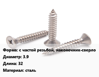 Саморез с частой резьбой, наконечник-сверло D=3.9 L=32 сталь, упаковка 1000 шт цена от 681.43 ₽ / кг, где купить, условия доставки в Перми и Пермской области