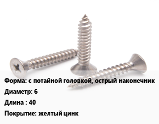 Саморез с потайной головкой, острый наконечник D=6 L=40 желтый цинк, упаковка 1000 шт цена от 999 ₽ / кг, где купить, условия доставки в Перми и Пермской области