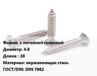 Саморез с потайной головкой D=4.8 L=38 нержавеющая сталь ГОСТ: DIN 7982