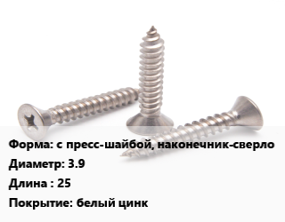Саморез с пресс-шайбой, наконечник-сверло D=3.9 L=25 белый цинк, упаковка 15000 шт, для оконного профиля цена от 5 333 ₽ / кг, где купить, условия доставки в Перми и Пермской области