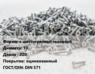 Шуруп с шестигранной головкой 10х220 оцинкованный ГОСТ: DIN 571, кг цена от 275.9 ₽ / кг, где купить, условия доставки в Перми и Пермской области