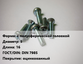 Винт с полусферической головкой 5х16 DIN 7985 оцинкованный, по запросу,цена за 1000 шт,цена за шт, кг цена от 449.49 ₽ / кг, где купить, условия доставки в Перми и Пермской области