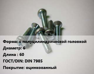 Винт с полуцилиндрической головкой 6х60 DIN 7985 оцинкованный, РМЗ, кг цена от 129.63 ₽ / кг, где купить, условия доставки в Перми и Пермской области