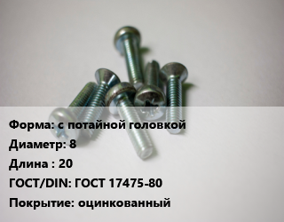 Винт с потайной головкой 8х20 ГОСТ 17475-80 оцинкованный, упаковка 1000 шт,упаковка 5 кг, кг цена от 343.71 ₽ / кг, где купить, условия доставки в Перми и Пермской области