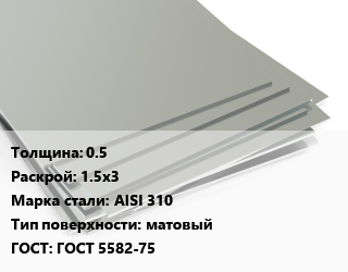 Лист нержавеющий 0.5 1.5х3 Сталь: AISI 310 Тип:матовый ГОСТ 5582-75, по запросу цена от 322 147 ₽ / т, где купить, условия доставки в Перми и Пермской области
