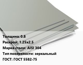 Лист нержавеющий 0.8 1.25х2.5 Сталь: AISI 304 Тип:зеркальный ГОСТ 5582-75